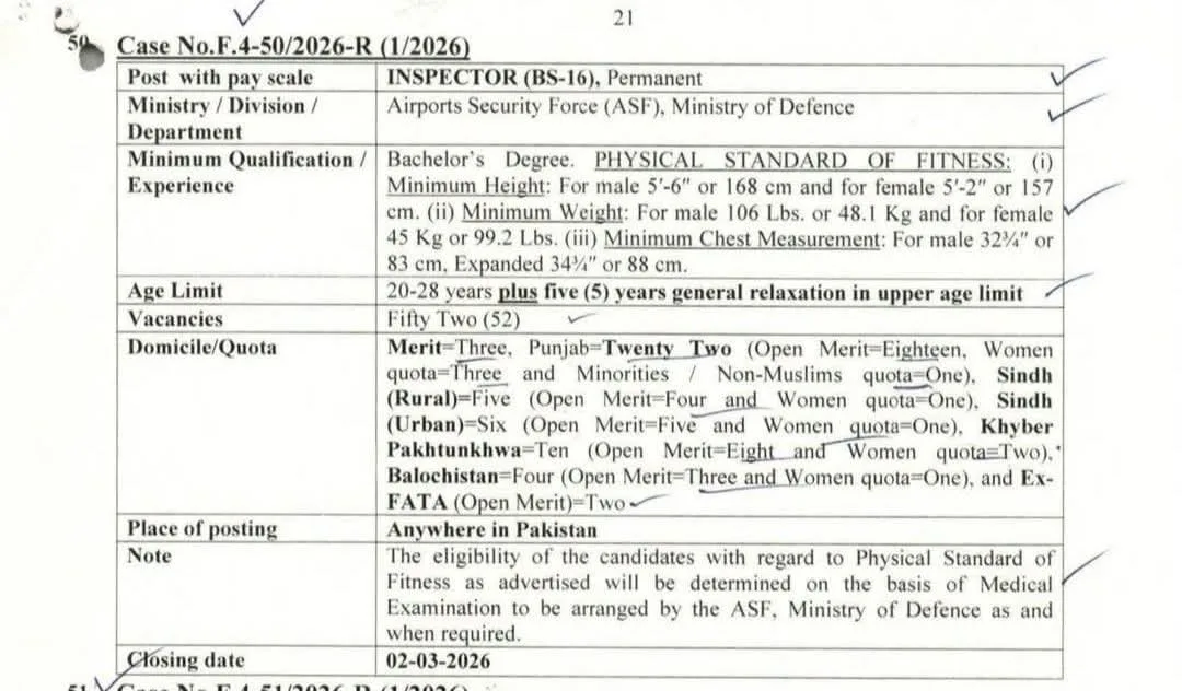 The Airports Security Force (ASF) is recruiting 52 Inspectors (BS-16) on a permanent basis.These vacancies are distributed across Pakistan under Case No. F.4-50/2026-R.