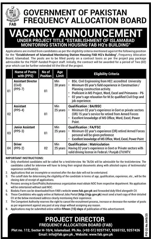 The Government of Pakistan’s Frequency Allocation Board (FAB) has announced new job openings for a PSDP-funded project titled “Establishment of Islamabad Monitoring Station Housing FAB HQ’s Building.” Applications are invited from eligible candidates to fill these positions, which are based in Islamabad.