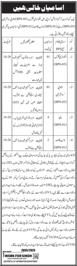 A government organization in Karachi has announced a series of job openings for various positions, inviting applications from eligible candidates domiciled in Sindh Province. The recruitment drive aims to fill several posts ranging from BPS-01 to BPS-05 on a merit basis.