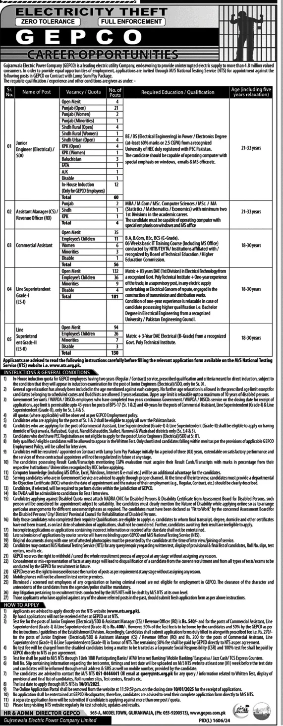 Gujranwala Electric Power Company (GEPCO), a leading electric utility company in Pakistan, is committed to delivering uninterrupted electricity to over 4.8 million customers. GEPCO is inviting dynamic and qualified individuals to apply for various positions through M/S National Testing Service (NTS).