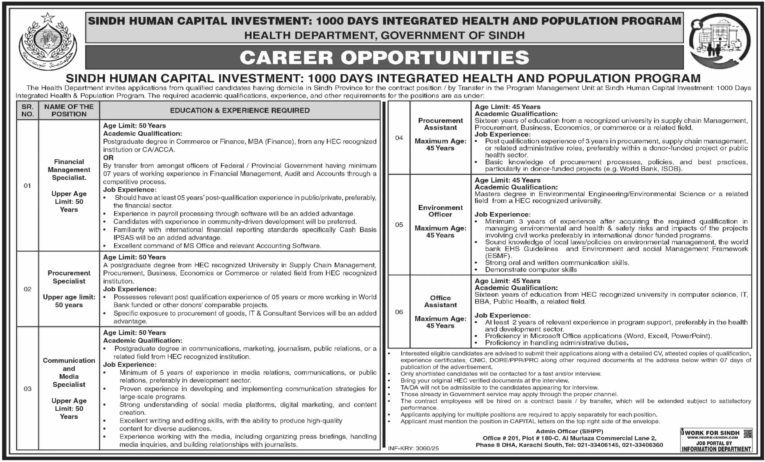 The Health Department of the Government of Sindh has announced a major recruitment drive for the “Sindh Human Capital Investment: 1000 Days Integrated Health and Population Program.” Applications are invited from qualified candidates holding a domicile in Sindh Province for various specialist and assistant roles on a contract basis or by transfer.