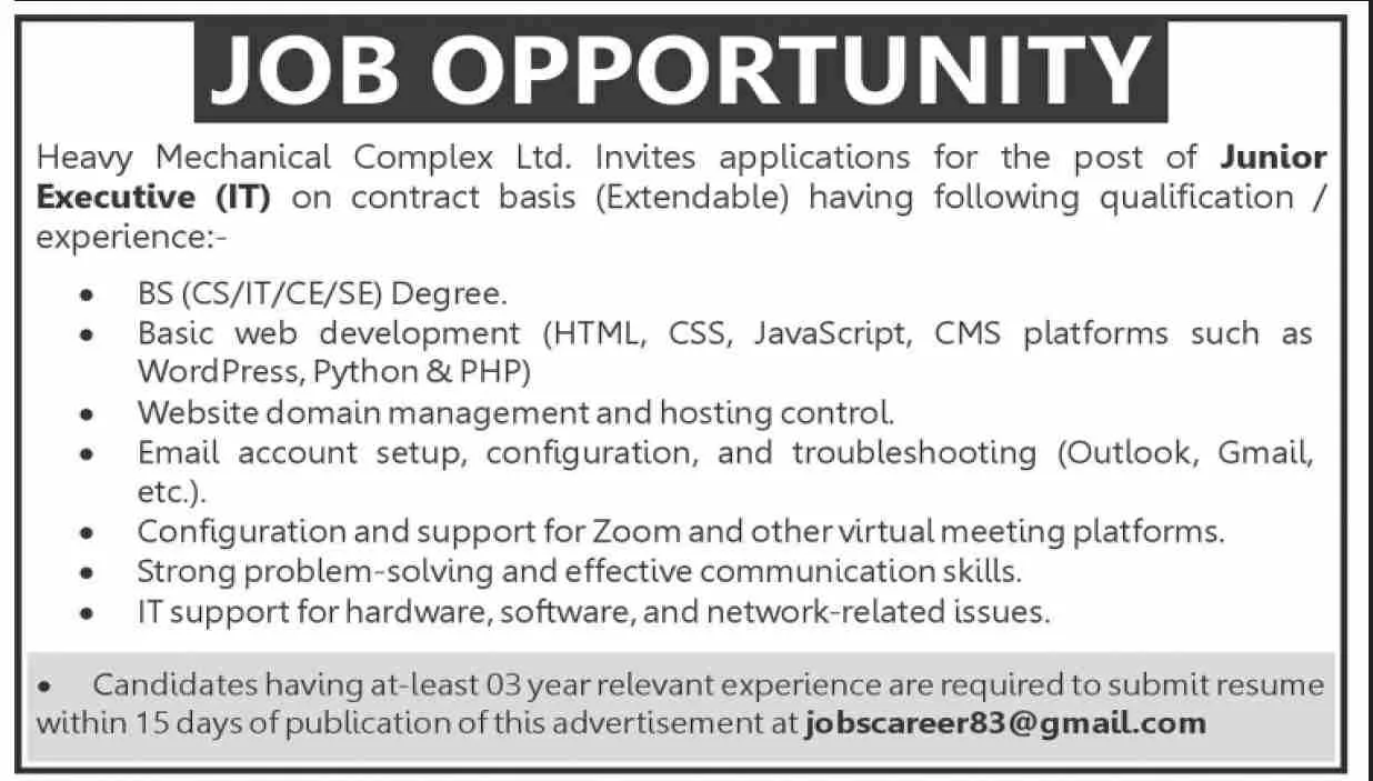 Heavy Mechanical Complex Ltd. is inviting applications for the position of Junior Executive (IT). This is a contract-based position with the potential for extension, offering a valuable opportunity for an IT professional with a diverse skill set to join a prominent industrial organization.