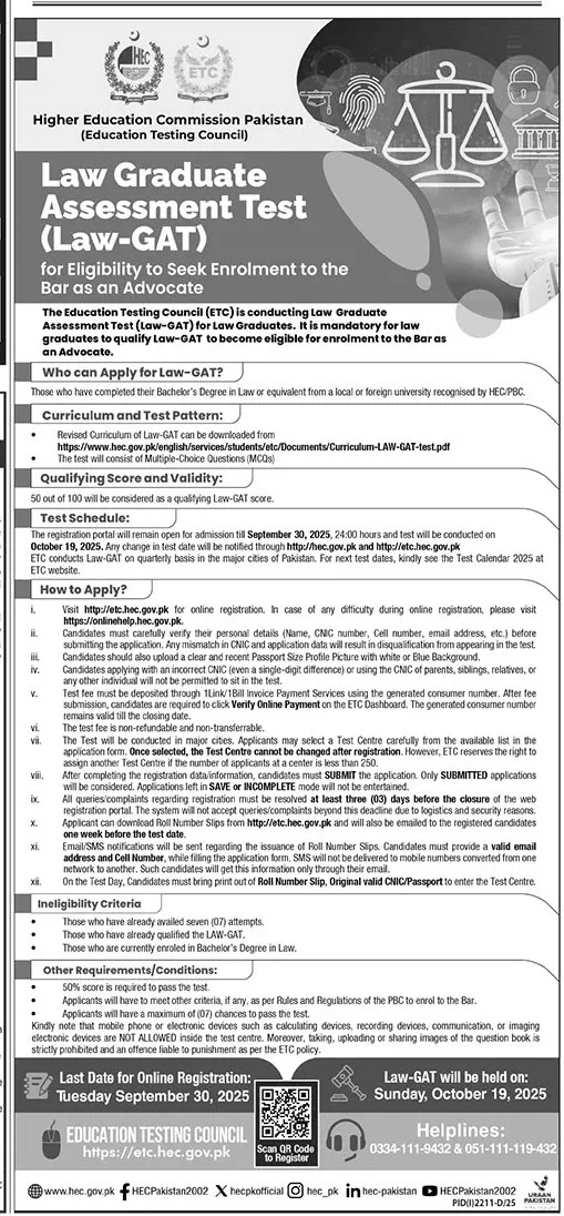 The Higher Education Commission (HEC) of Pakistan, through its Education Testing Council (ETC), has officially announced the schedule for the Law Graduate Assessment Test (Law-GAT). This test is a mandatory prerequisite for all law graduates aspiring to seek enrolment as an Advocate with their respective Bar Councils. Passing the Law-GAT is the crucial first step toward a professional legal career in Pakistan.