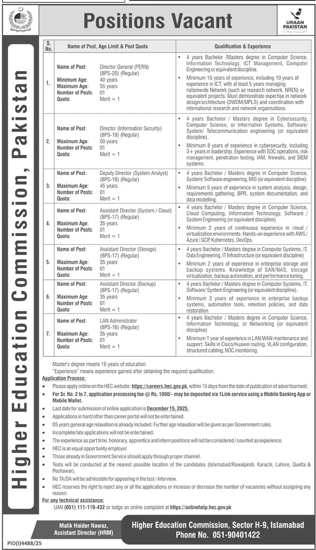 According to the official notice, these positions are available on a regular basis, and qualified Pakistanis can submit online applications through the HEC careers portal. The deadline for application submission is December 15, 2025.