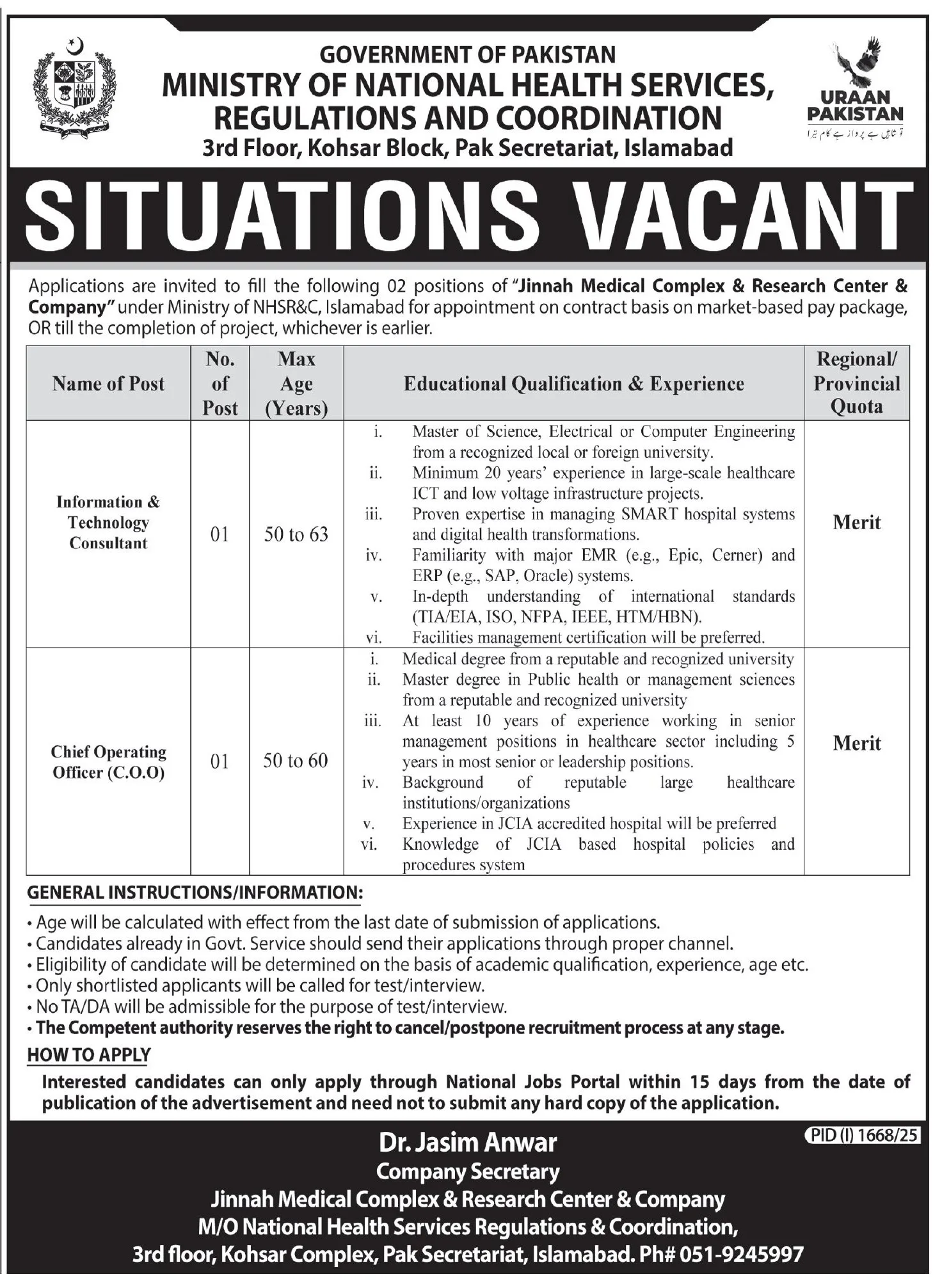 The Government of Pakistan’s Ministry of National Health Services, Regulations and Coordination has announced vacancies for two key senior positions at the Jinnah Medical Complex & Research Center & Company in Islamabad. The ministry is seeking highly qualified and experienced individuals for the roles of Information & Technology Consultant and Chief Operating Officer (C.O.O) on a contract basis.