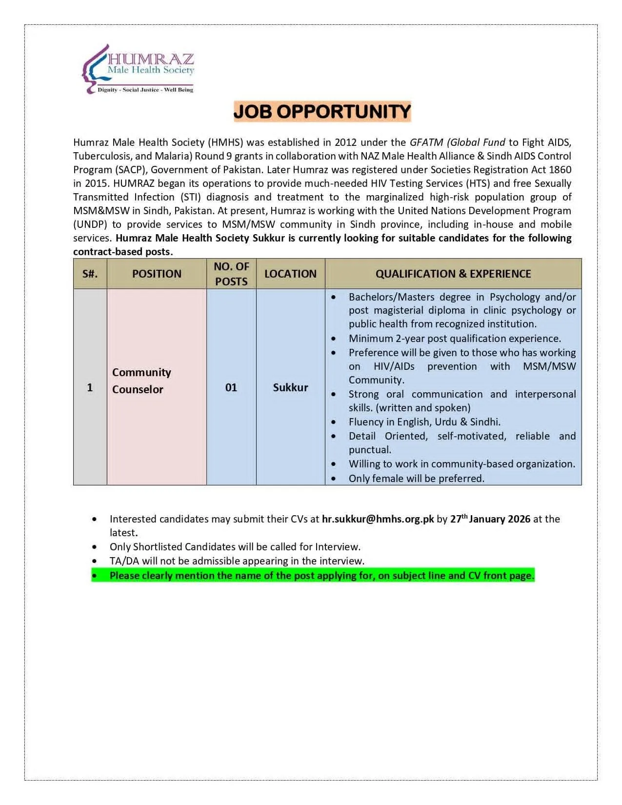 HMHS Sukkur is looking for a Community Counselor (01 Post) to provide psychological support and guidance.