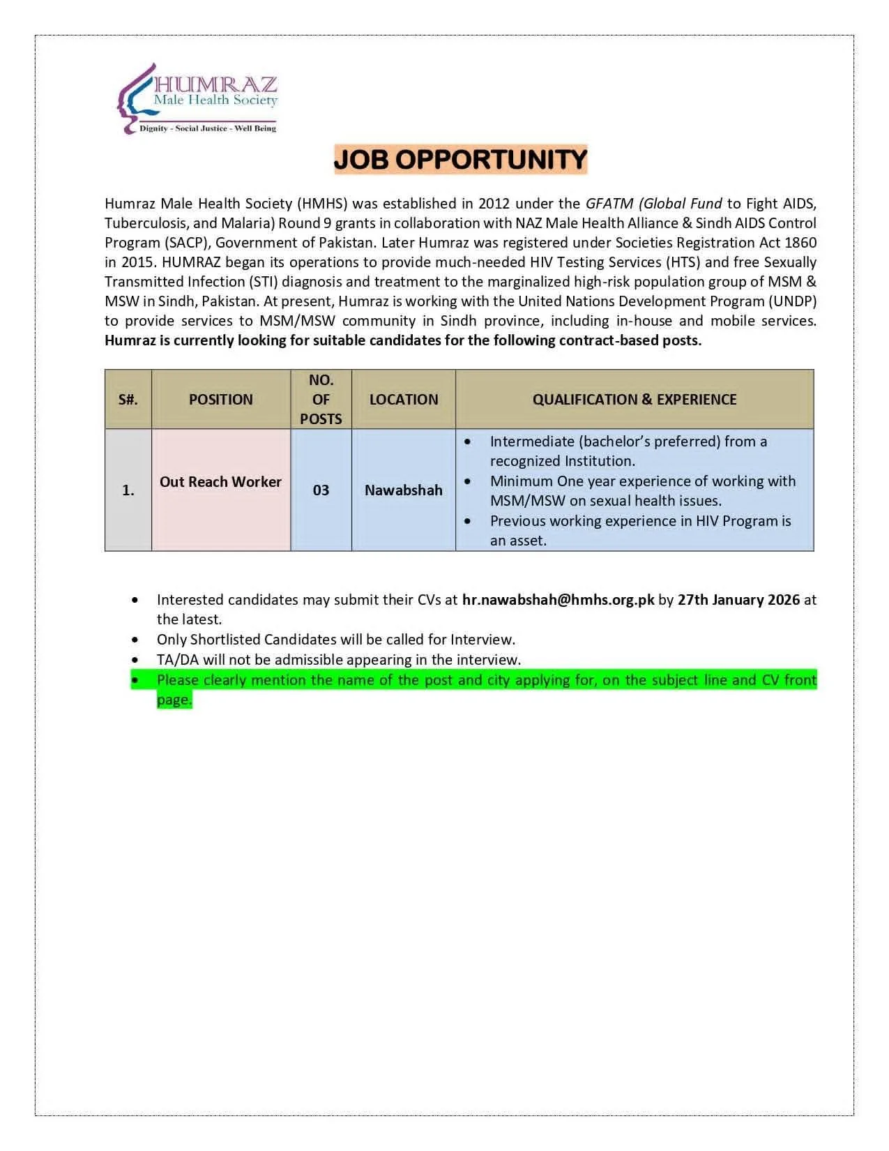 In Nawabshah, the focus is heavily on community mobilization. HMHS has announced 03 Posts for Outreach Workers.