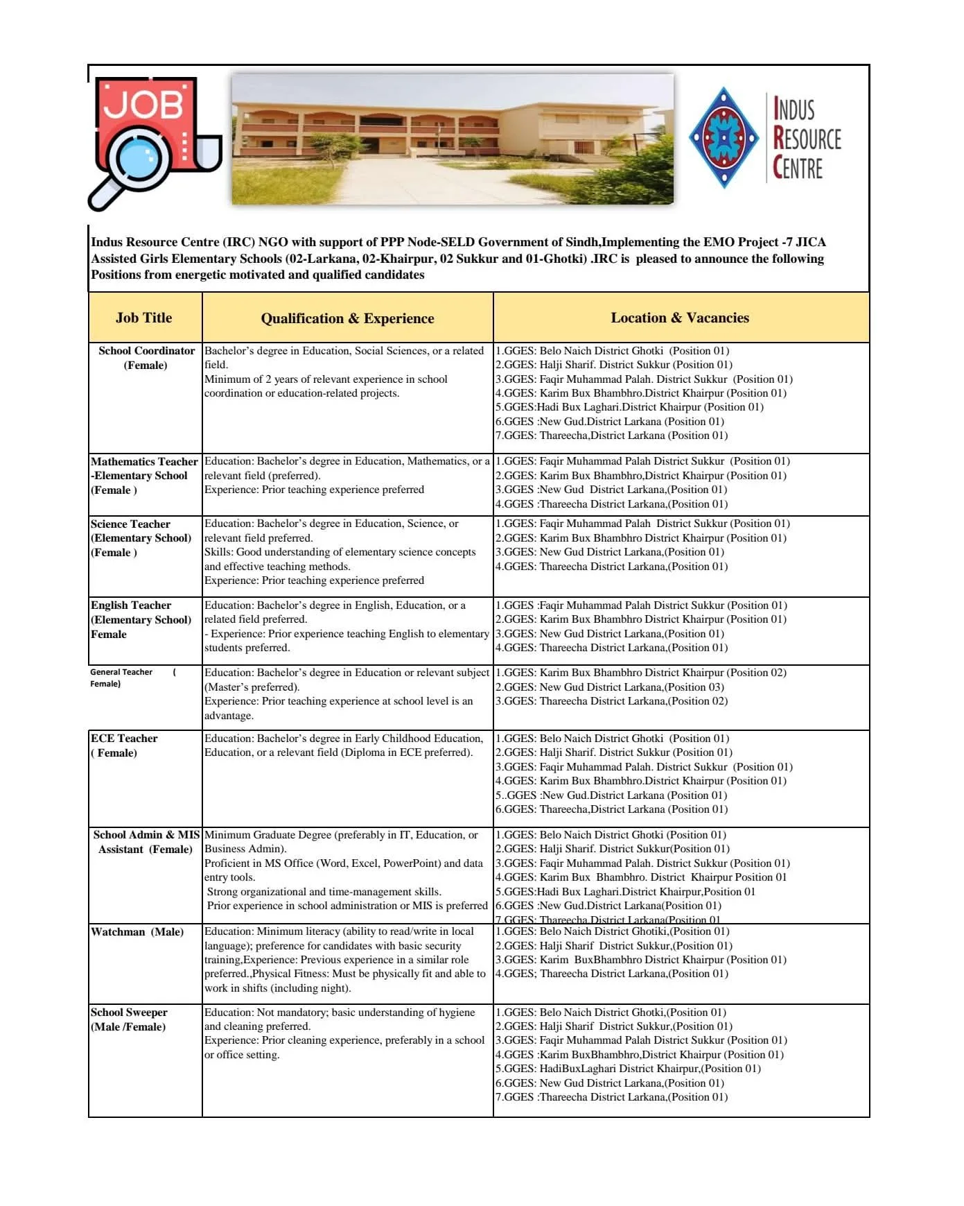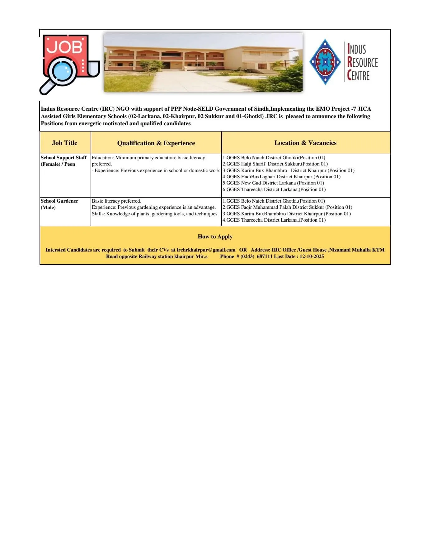 The Indus Resource Centre (IRC), an NGO working in collaboration with the PPP Node-SELD Government of Sindh, has announced a major recruitment drive for its “EMO Project-7 JICA Assisted Girls Elementary Schools.” Applications are invited from energetic, motivated, and qualified candidates for various teaching, administrative, and support staff positions.
