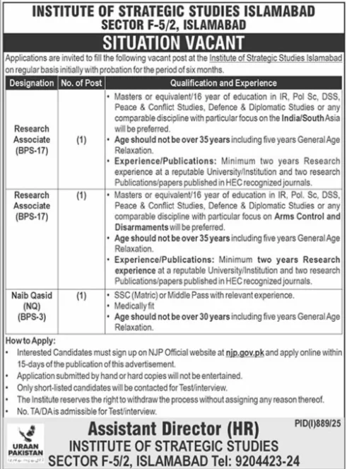 Career Opportunities at Institute of Strategic Studies Islamabad 2025