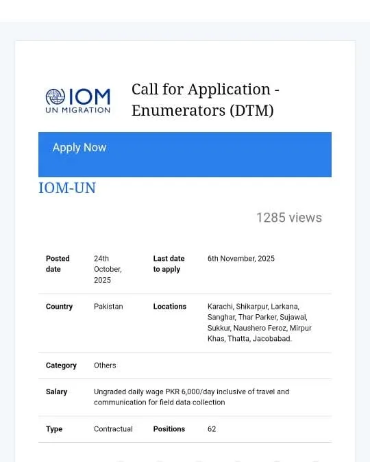 IOM – UN Migration Agency Announces 62 Enumerator Positions Across Sindh