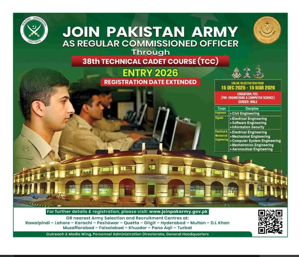 The Pakistan Army has officially announced the 38th Technical Cadet Course (TCC) for Entry 2026. This program is one of the most elite entry paths into the armed forces, allowing young Pakistani males to pursue a degree in various engineering disciplines at top military institutions like NUST, and then join the army as a Captain.