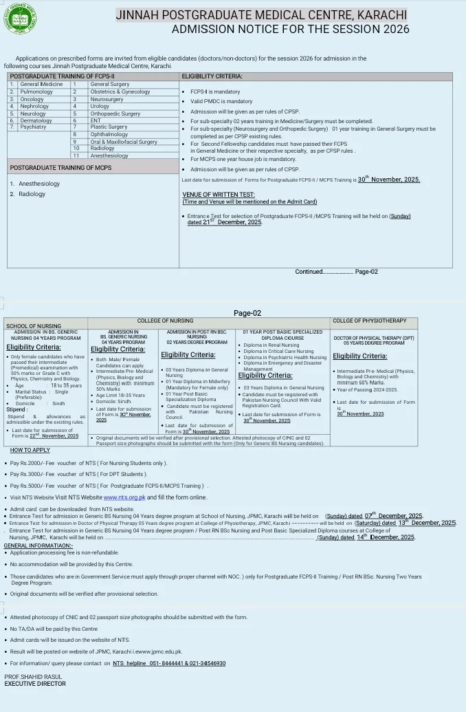 Jinnah Postgraduate Medical Centre (JPMC), Karachi, a renowned medical institution, has announced admissions for the session 2026 for various postgraduate programs. This includes admissions for FCPS-II, MCPS (Doctors/Non-Doctors), as well as nursing (Generic BSN, Post RN BSc) and Doctor of Physical Therapy (DPT) programs. This is a vital opportunity for medical graduates, nursing professionals, and aspiring physical therapists to further their education and careers at a prestigious institution.