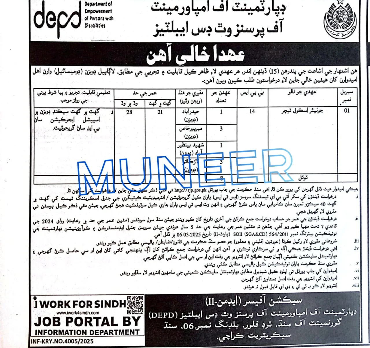 The Department of Empowerment of Persons with Disabilities (DEPD), Government of Sindh, has announced a recruitment drive for 9 vacant posts of Junior School Teacher (JST). Applications are invited from eligible candidates who meet the specified educational and experiential criteria, and hold a domicile of the Province of Sindh.