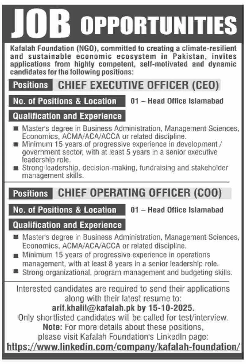 This is a significant opportunity for experienced leaders to take the helm of a growing organization and drive its strategic vision. The positions are for Chief Executive Officer (CEO) and Chief Operating Officer (COO), both based at the Head Office in Islamabad. The deadline for applications is October 15, 2025.