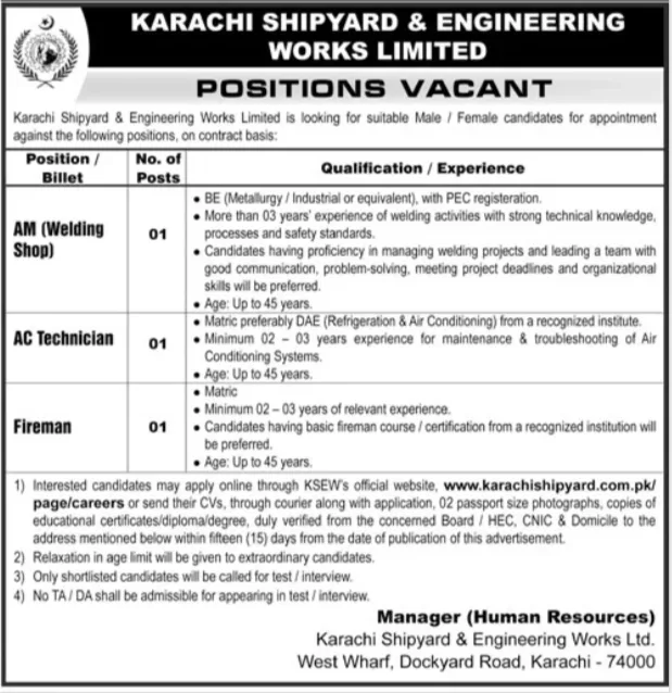 Karachi Shipyard & Engineering Works Limited (KSEW) has announced new career opportunities for male and female candidates on a contract basis. KSEW is one of Pakistan’s leading defense and engineering organizations, offering stable jobs with excellent professional growth.
