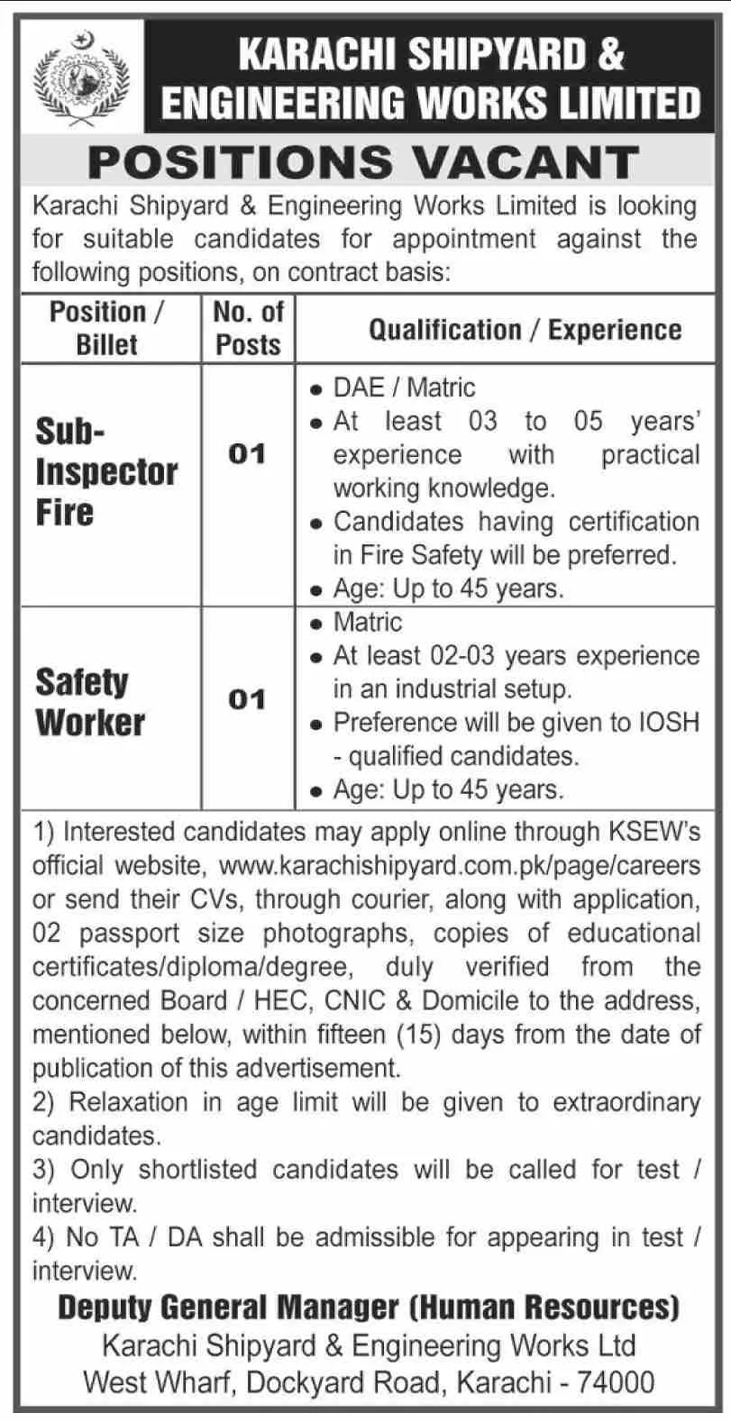 Karachi Shipyard & Engineering Works Ltd is hiring for Sub-Inspector Fire and Safety Worker roles on a contract basis. Matric/DAE with experience required. Apply online within 15 days.