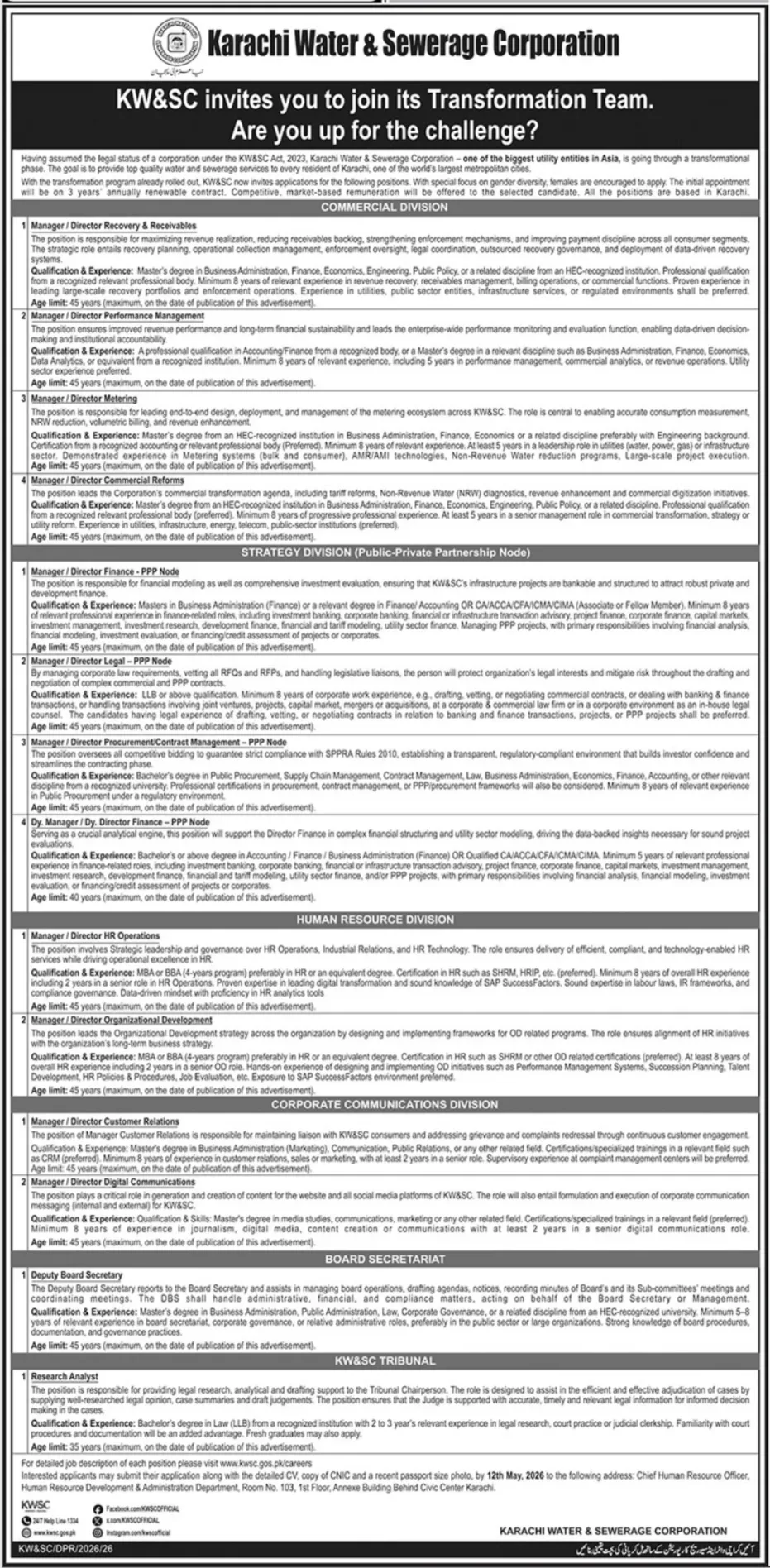 Karachi Water and Sewerage Corporation Jobs 2026, KW&SC Jobs Karachi, Government Jobs Karachi 2026, Public Sector Jobs Pakistan, Manager Jobs Karachi, Director Jobs Pakistan, Latest Jobs in Karachi 2026, KWSC Careers, Water Corporation Jobs Pakistan