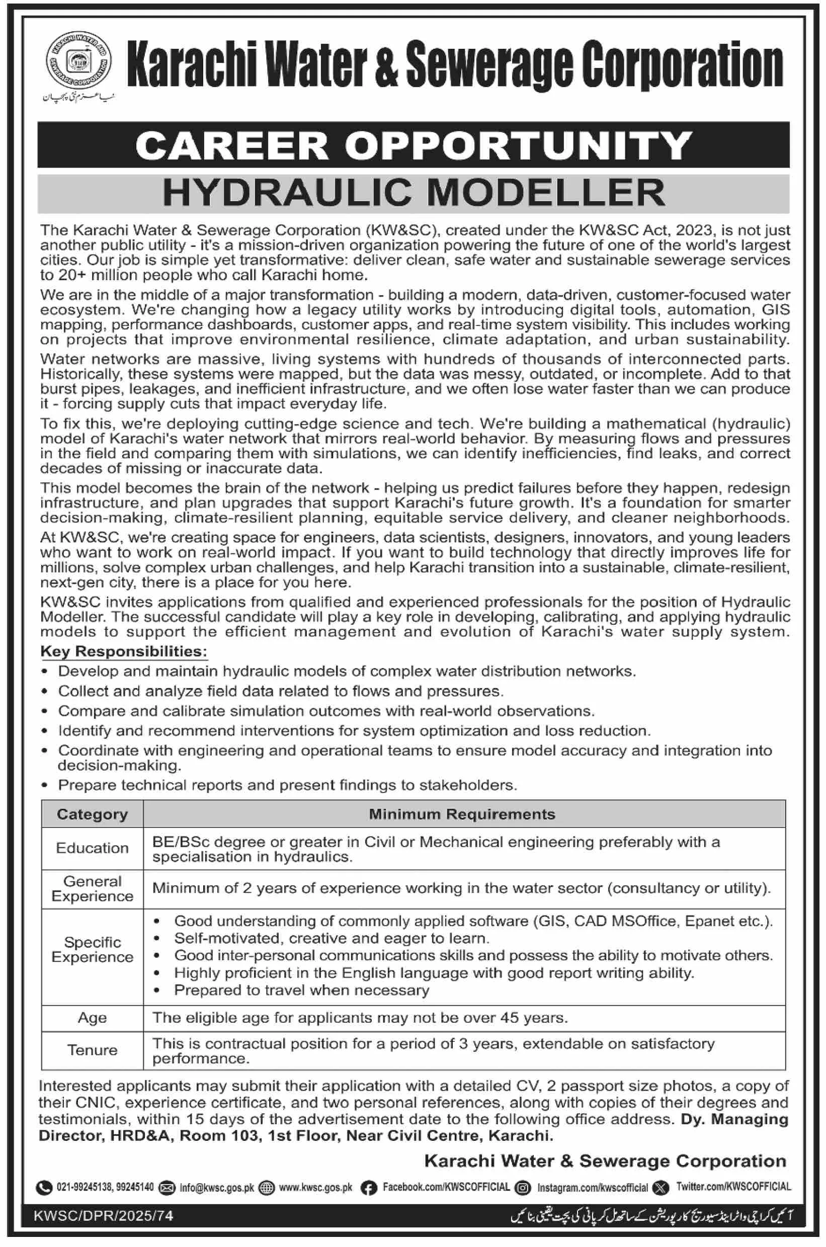 Hydraulic Modeller Job in Karachi – KW&SC Careers 2025