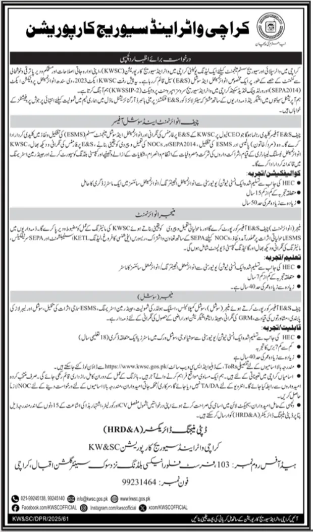 The Karachi Water & Sewerage Corporation (KWSC) is seeking Expressions of Interest from highly qualified and experienced professionals to lead its Environmental and Social (E&S) safeguards. This recruitment is part of the World Bank-funded Karachi Water and Sewerage Services Improvement Project (KWSSIP-2), a major initiative to reform and modernize the city’s water and sanitation infrastructure.