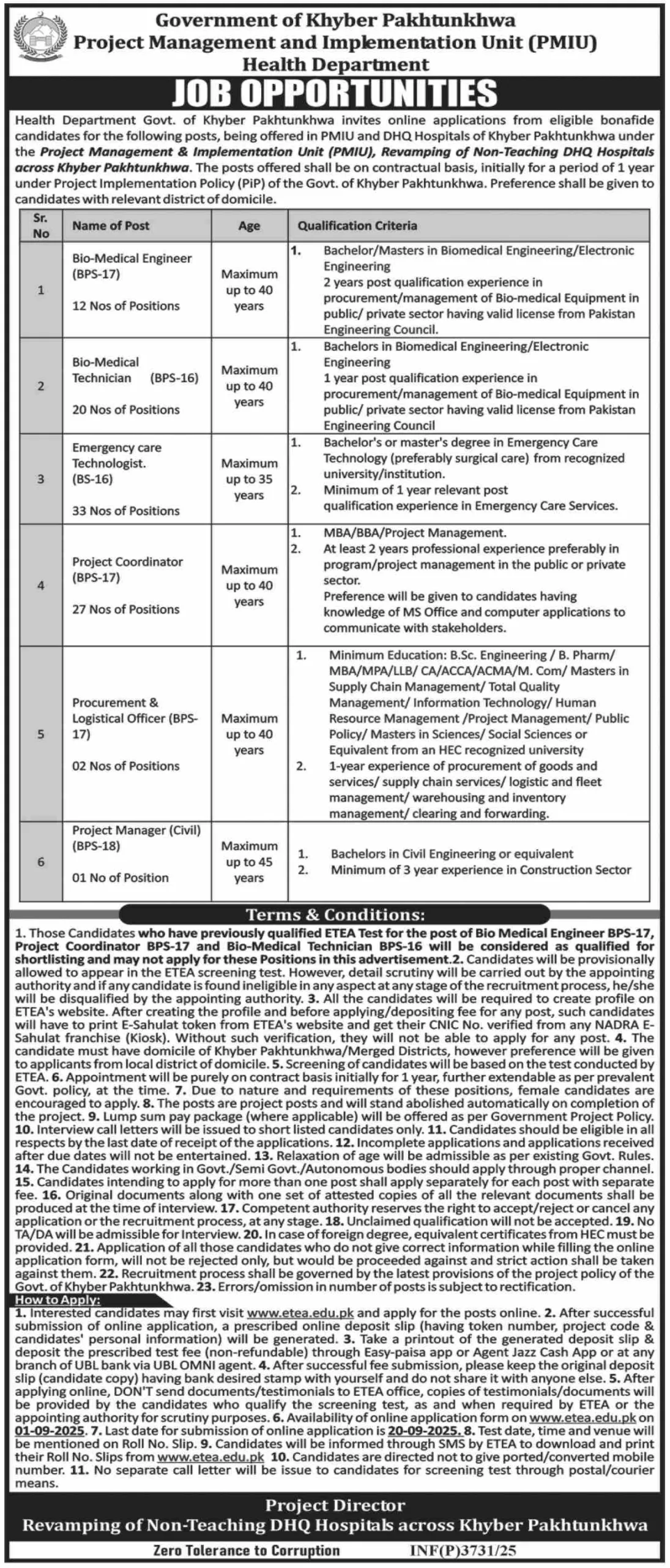 ETEA Application: Candidates must apply online via the ETEA website (www.etea.edu.pk). Only Bio-Medical Engineer (BPS-17) and Bio-Medical Technician (BPS-16) applicants are required to take an ETEA test.