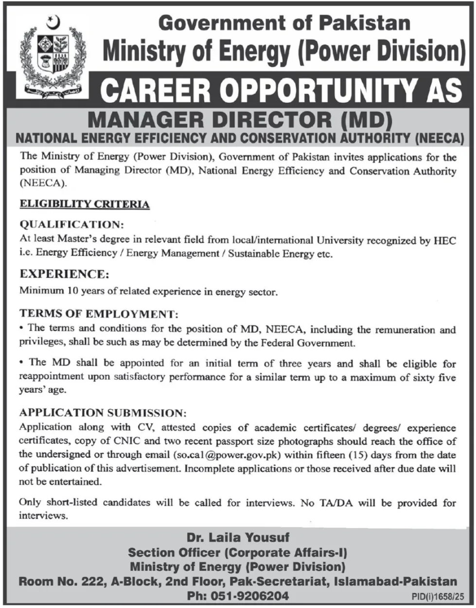 The Government of Pakistan’s Ministry of Energy (Power Division) has announced a significant career opportunity for the position of Managing Director (MD) at the National Energy Efficiency and Conservation Authority (NEECA). The Ministry is inviting applications from highly qualified and experienced professionals to lead the nation’s primary institution for energy efficiency and conservation.
