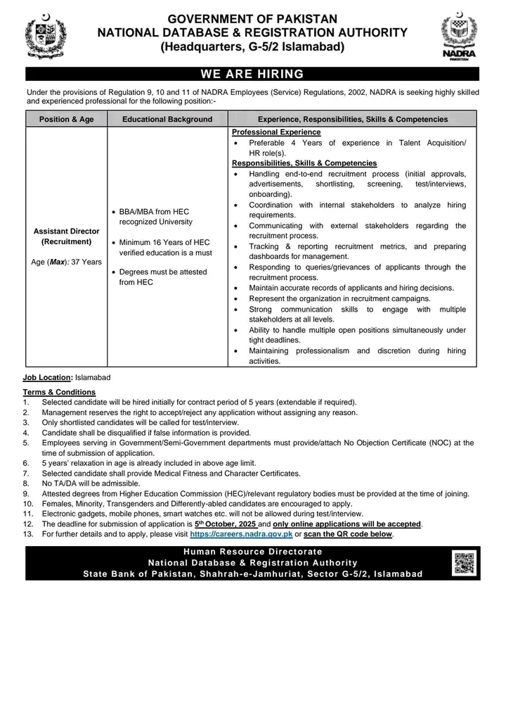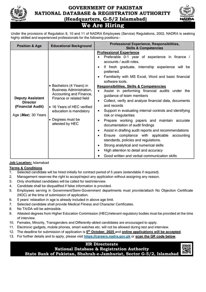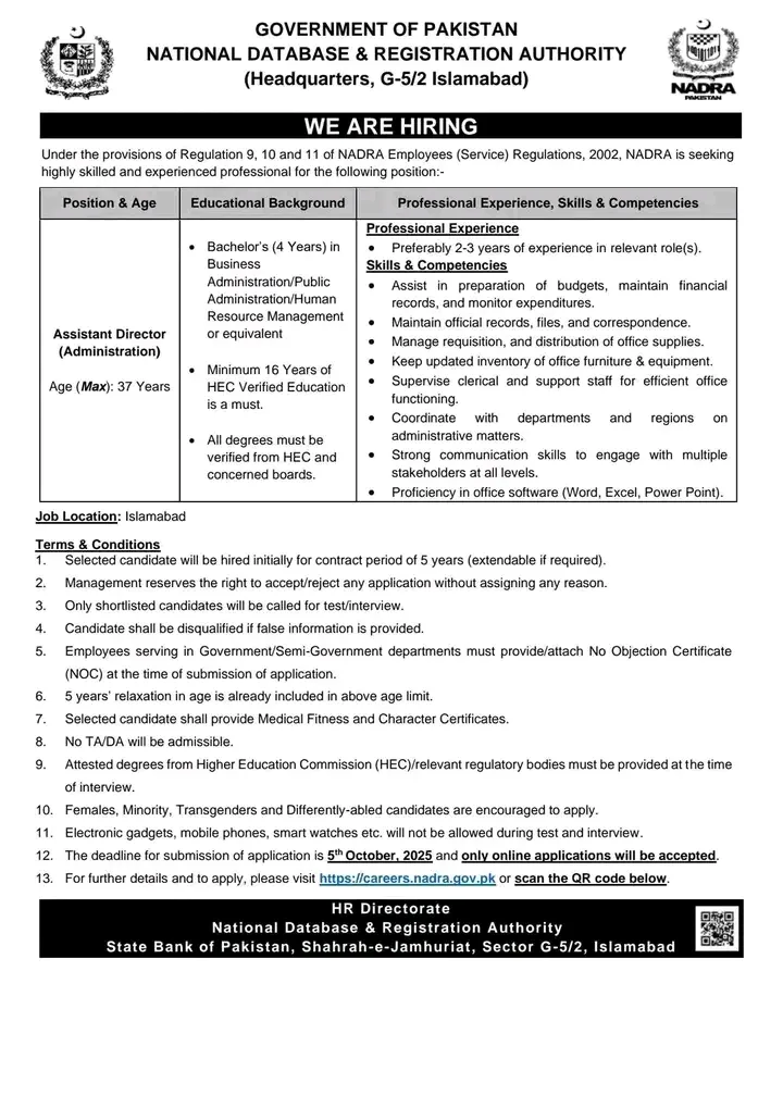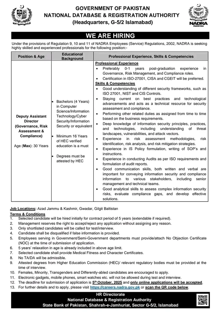 Application Process: For further details and to apply, interested candidates should visit the official NADRA Careers website: https://careers.nadra.gov.pk or scan the provided QR code.