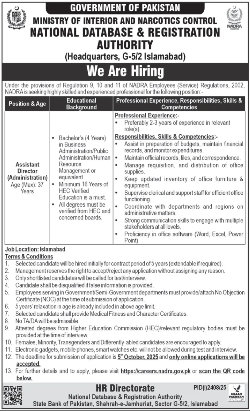 The National Database & Registration Authority (NADRA), under the Ministry of Interior and Narcotics Control, Government of Pakistan, is actively seeking a highly skilled and experienced professional for the position of Assistant Director (Administration). This opportunity is based at NADRA Headquarters in G-5/2, Islamabad.