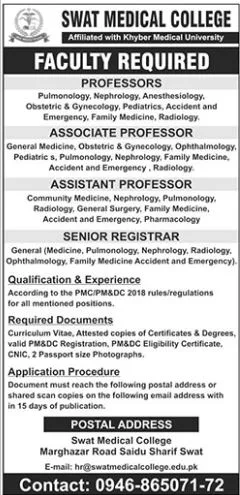 Swat Medical College, affiliated with Khyber Medical University, is inviting applications from qualified and experienced professionals for various faculty positions.