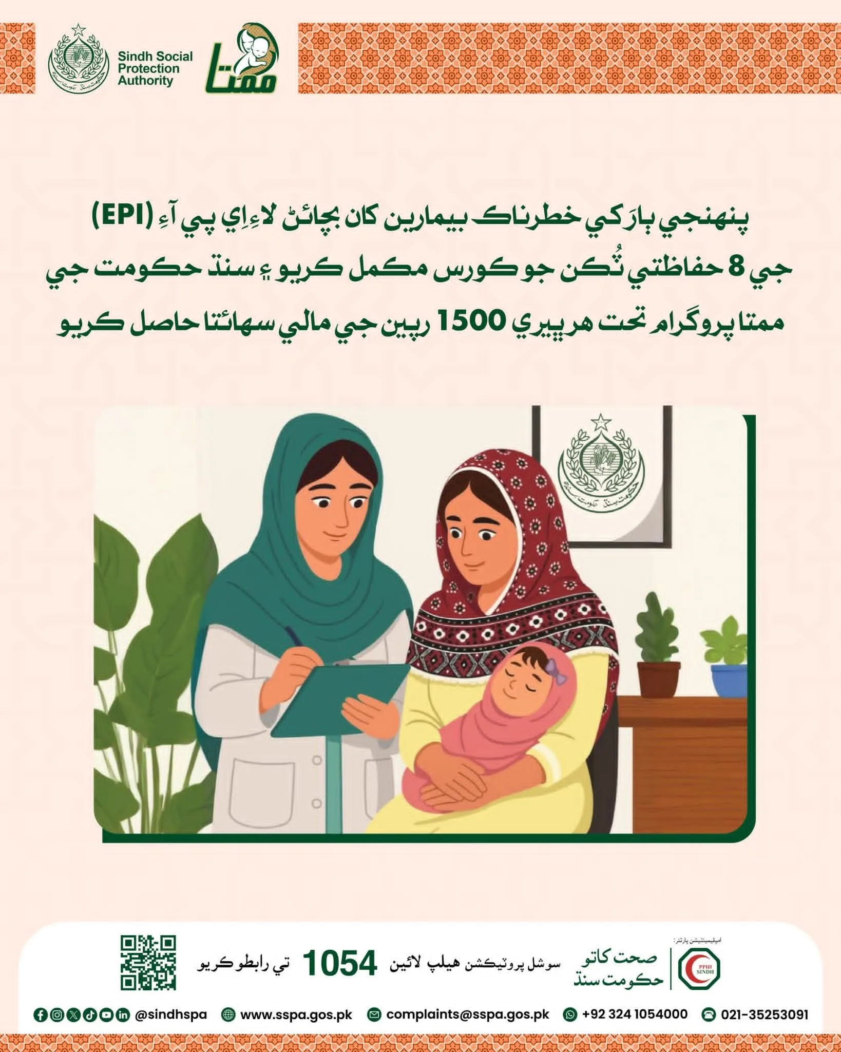 The Sindh Government Mamta Program 2026, implemented through the Sindh Social Protection Authority (SSPA), is a major initiative aimed at improving maternal and child health across Sindh. Under this program, mothers can receive financial assistance of Rs. 1500 for completing their child’s routine immunization course under the Expanded Programme on Immunization (EPI).