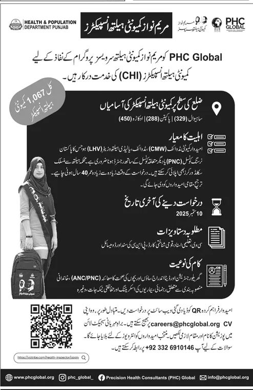 Meta Description: PHC Global is hiring 1,067 Community Health Inspectors (CHIs) for Sahiwal, Pakpattan & Okara. CMW, Midwife, or LHV with PNC registration can apply by Oct 10, 2025.