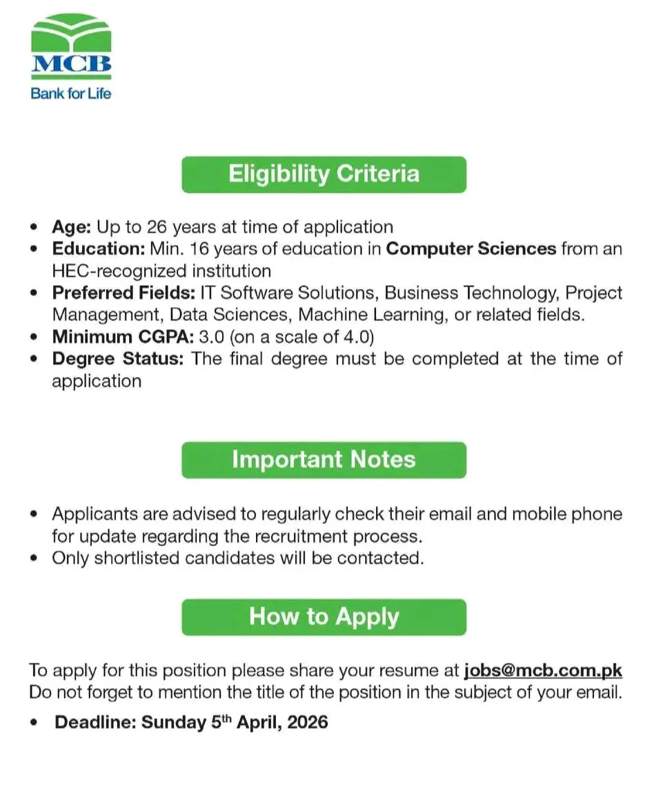 SEO Summary: MCB Bank Jobs 2026 offers the Trainee Business Officer Tech Program (TBO-Tech) for Computer Science graduates with a 3.0 CGPA. This Lahore-based permanent role is a top choice for freshers looking for IT jobs in Pakistan’s banking sector. Apply by April 5, 2026.