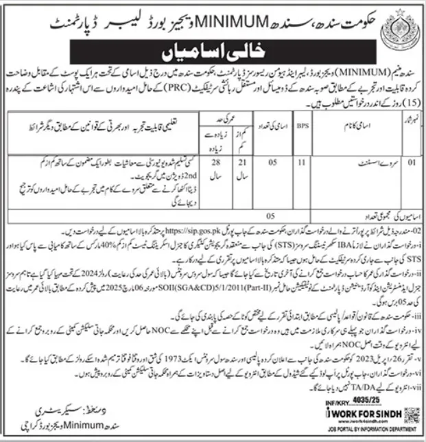 The Government of Sindh, Minimum Wages and Labour Board (MIMIMUM), operating under the Labour Department, is inviting applications from eligible candidates holding a Domicile/PRC of the Province of Sindh. Applications are sought to fill 5 vacant posts of Assistant (BPS-11) based on open merit and regional quotas.