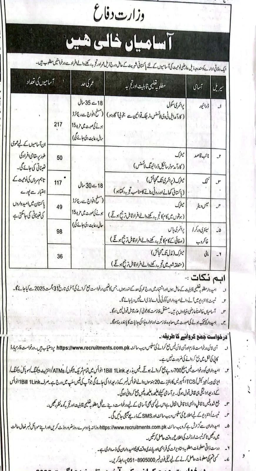 A federal government department, the Ministry of Defence, has announced a major recruitment drive, inviting applications from Pakistani nationals for more than 500 positions. The ministry is looking for qualified and experienced individuals to fill various roles, with a submission deadline of August 31, 2025.