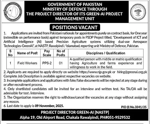 The Ministry of Defence, Government of Pakistan, through the Project Director of its Green-AI Project Management Unit, has invited applications from Pakistani nationals for a vacancy in a cutting-edge agricultural technology project. The project, titled “Development of ICT and Artificial Intelligence (AI) based Precision Agriculture systems utilizing dual-use Aerospace Technologies-GreenAI,” is based at NASTP, Rawalpindi/Islamabad.