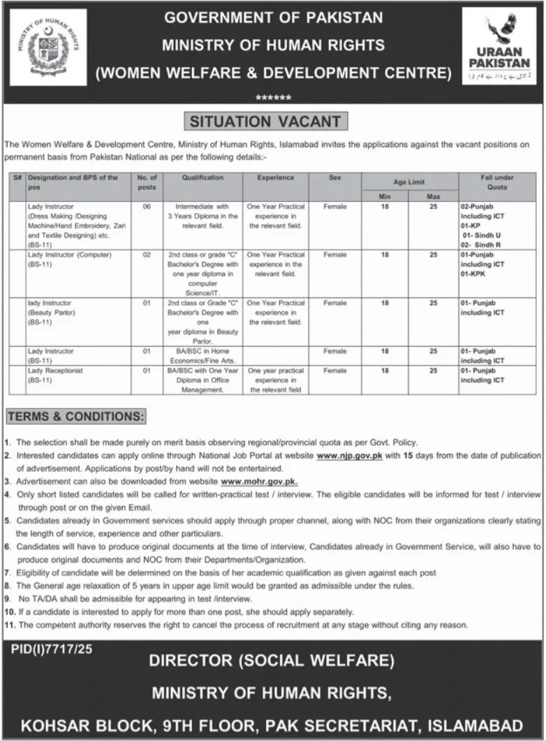 The Ministry of Human Rights (MOHR), Government of Pakistan, is inviting applications from qualified female candidates for various technical and administrative positions on a permanent basis. These posts are based in the Women Welfare & Development Centre, Islamabad, and fall under different provincial and regional quotas.