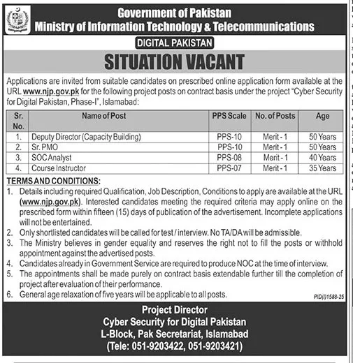 The Government of Pakistan’s Ministry of Information Technology & Telecommunications (MOITT) has announced a significant recruitment drive for its ambitious “Cyber Security for Digital Pakistan, Phase-I” project. This initiative, based in Islamabad, is at the forefront of the nation’s digital transformation agenda. The Ministry is seeking to hire skilled, experienced, and motivated professionals on a contract basis for several key positions.