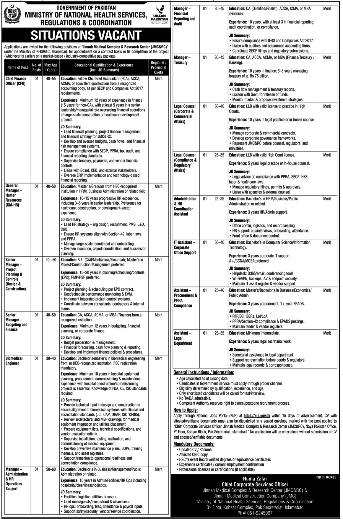 The Government of Pakistan, Ministry of National Health Services, Regulations & Coordination (NHSRC), has officially announced new career opportunities at the Jinnah Medical Complex & Research Center (JMCRC) and Jinnah Medical Construction Company (JMCC) Islamabad. This recruitment drive offers multiple high-level, technical, and administrative positions for qualified professionals across Pakistan.