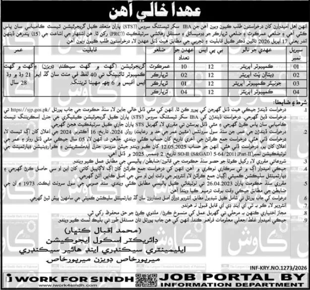 The Directorate of School Education (Elementary, Secondary & Higher Secondary) Mirpurkhas has officially announced several regular job openings for technical staff. This recruitment aims to fill vacancies for Computer Operators, Data Entry Operators, and Junior Computer Operators (BPS-12) in the districts of Umerkot and Tharparkar.