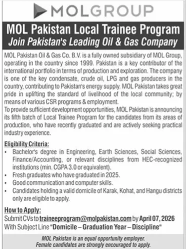 This article provides a comprehensive guide for recent graduates in Khyber Pakhtunkhwa regarding the latest career opening at MOL Pakistan Oil & Gas Co. B.V. If you are a resident of Karak, Kohat, or Hangu, this fifth batch of the Local Trainee Program is your chance to enter the prestigious oil and gas sector.