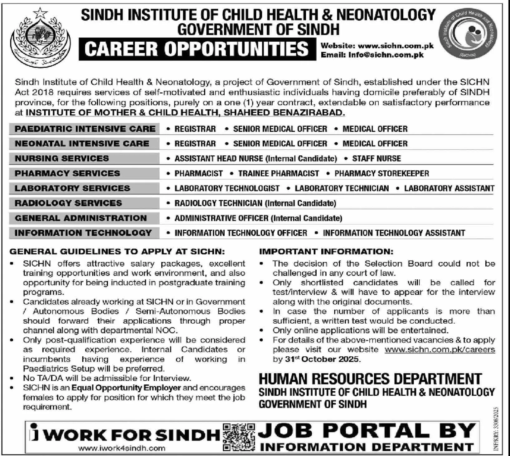 www.sichn.com.pk/careersApplication Deadline: The last date to apply is 31st October 2025.