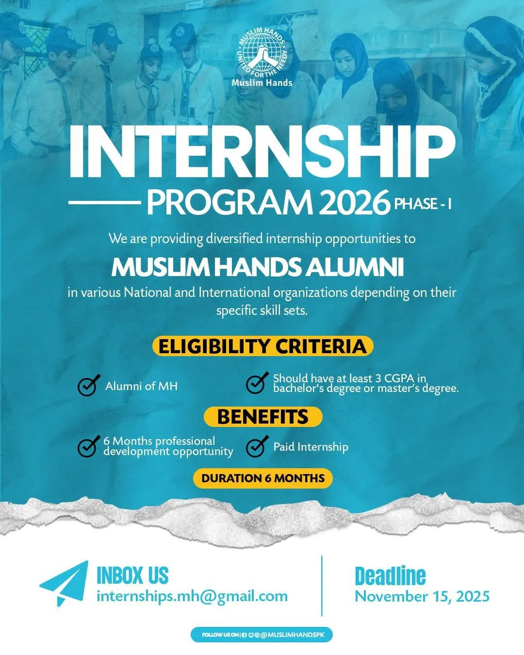 Muslim Hands has officially announced the launch of its “Internship Program 2026 – Phase I,” offering diversified internship opportunities exclusively for its alumni. The program is designed to place talented alumni in various national and international organizations based on their specific skill sets.