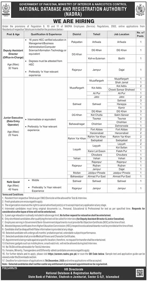 Official Job Portal: https://careers.nadra.gov.pk/ (or scan the QR Code on the ad).