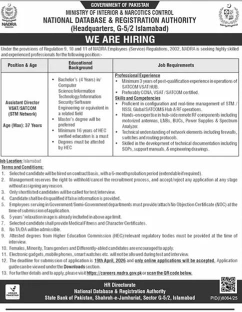 The National Database & Registration Authority (NADRA), a global leader in biometric identification and digital governance, has officially announced a high-tier career opportunity for technical professionals. Under the Ministry of Interior & Narcotics Control, NADRA is seeking a highly skilled Assistant Director for VSAT/SATCOM (STM Network) to join its headquarters in Islamabad.