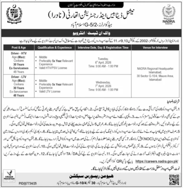For the driver positions, NADRA is conducting walk-in tests and interviews at the NADRA Regional Headquarter, Islamabad.