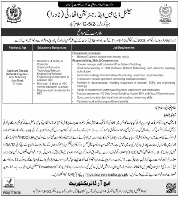 The National Database and Registration Authority (NADRA) has officially announced multiple job vacancies for its headquarters and regional offices in Islamabad. The recruitment drive includes high-level technical roles such as Assistant Director (.NET Developer) and Assistant Director (Network Engineer), as well as walk-in interviews for HTV and LTV Drivers.