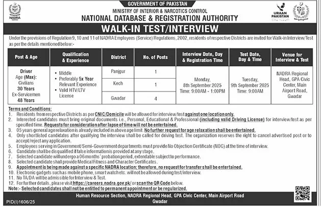 The National Database & Registration Authority (NADRA), operating under the Ministry of Interior & Narcotics Control, has announced immediate job openings for the position of Driver. The authority is inviting residents of the Gwadar, Kech, and Panjgur districts for a walk-in test and interview process.