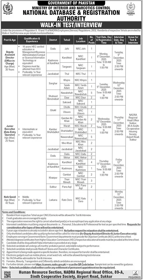 | Junior Executive (Data Entry Operator) (Max: 25 Yrs) | Kashmore/Kandhkot, Kashmore | Various NRCs | 5 | Thu, Dec 11, 2025 9:00 AM – 1:00 PM | Fri, Dec 12, 2025 2:00 PM onwards | NADRA Regional Head Office, Sukkur |