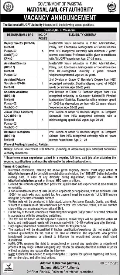 The Government of Pakistan’s National AML/CFT Authority has announced multiple job opportunities across various positions. Interested candidates are advised to carefully note the deadlines, download advertisements, and apply online through the official portal before the closing date.