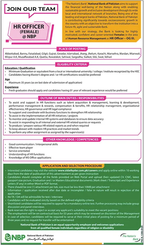 The National Bank of Pakistan (NBP), “The Nation’s Bank,” has announced a significant recruitment drive, inviting applications from highly motivated, confident, and career-oriented female professionals for the position of HR Officer (OG-III).