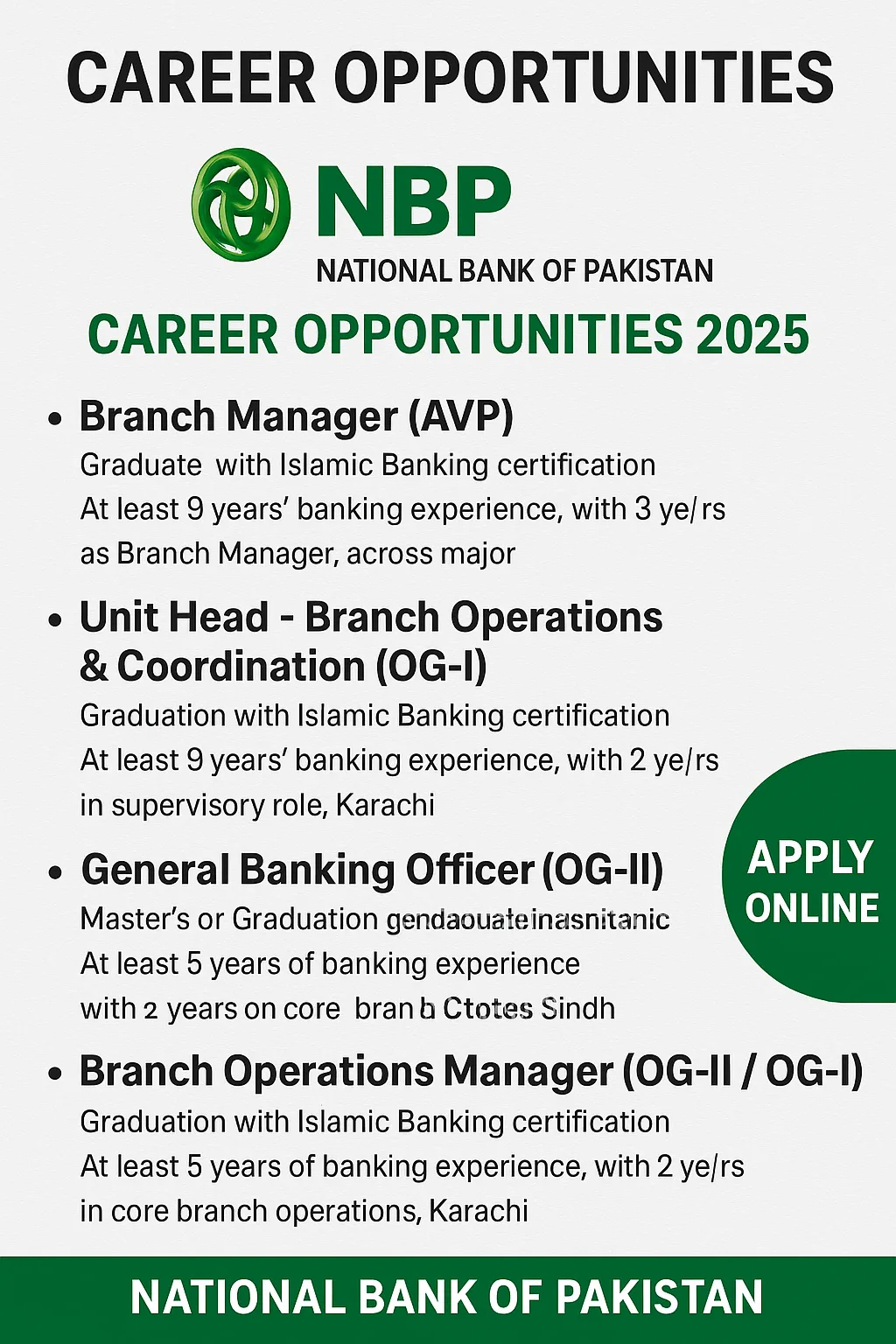 NBP has announced vacancies for Branch Manager, Unit Head (Operations), General Banking Officer, and Branch Operations Manager.